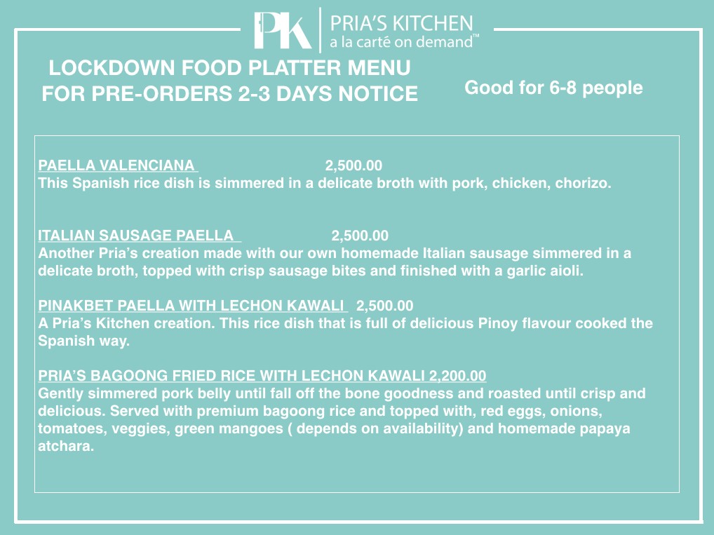We are an A la Carte on Demand™ service company that creates food platters for fuss-free, stress-free dining. We are your extended kitchen. Sit back, relax and we will do the work for you. Give us a call at 0917.819.0545 today!